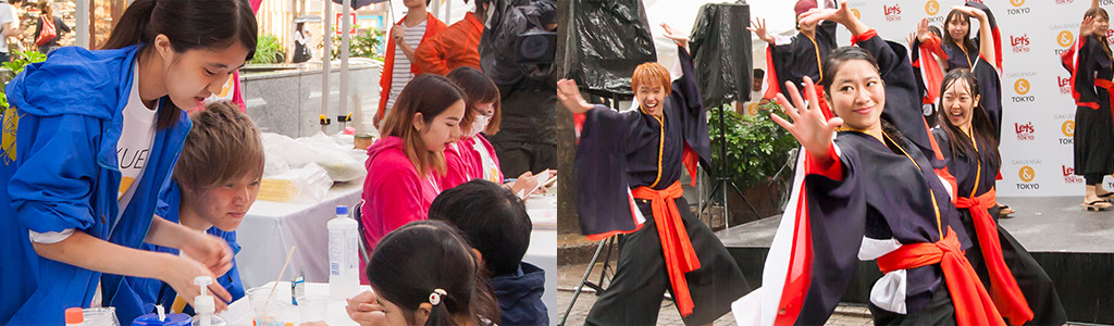 ステージ上では、早稲田大学の「下駄っぱーず」による下駄を履いて踊るパフォーマンスなど、東京文化の魅力を全面に出したパフォーマンスが行われました。各大学のブースでは、美大生による似顔絵や体験型の理科実験など、各大学の特色が表れた名物企画や模擬店が次々と披露されました。