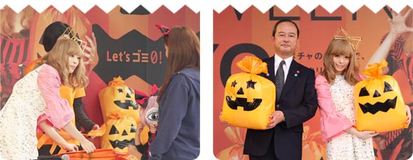 スペシャルサポーター・きゃりーぱみゅぱみゅさんを迎え、 HALLOWEEN&TOKYOの出発式が実施されました。東京都産業労働局次長 土渕 裕とのトークセッションや、きゃりーぱみゅぱみゅさんによるカボチャのごみ袋の配布が行われました。