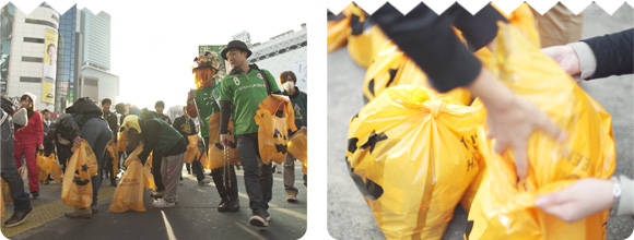 お祭りの後は、新宿・渋谷・六本木・秋葉原にて、カボチャのごみ袋片手にボランティアスタッフによるごみ拾いが実施されました。