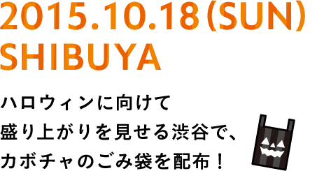 2015年10月30日(金)~31日(土)、ハロィン本番に向けて新宿・渋谷・六本木・秋葉原にて、カボチャのごみ袋を配布し、ごみの持ち帰りを呼び掛けました。