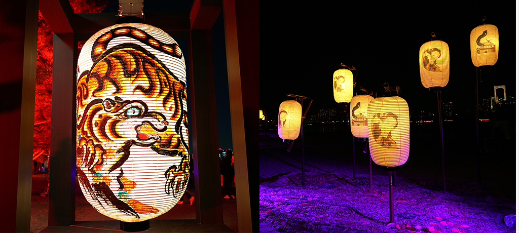 北斎の肉筆画に登場する虎と龍をモチーフとした3メートルの高さの巨大提灯「北斎巨大提灯」が、イベント会場の入口付近に設けられた門の両脇に出現。また、北斎が数多く描いていた妖怪をモチーフとしたお化け提灯のインスタレーション「百鬼夜行街道」が、夜の道を怪しく照らし出していました。