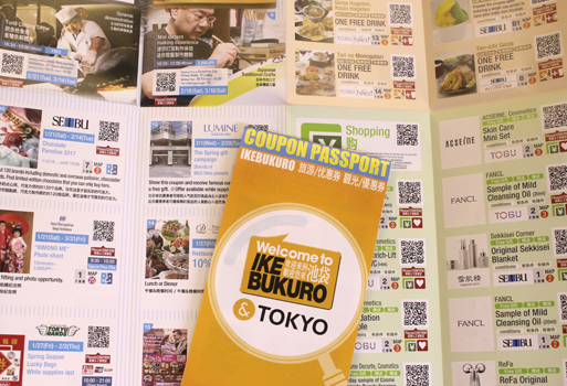 キャンペーン期間中、池袋エリアの対象店舗でショッピングや食事などで使える、お得なクーポンを集めた「クーポンパスポート」は、英語、中国語(繁体字・簡体字)で表記されています。期間中は、池袋駅や商業施設にも設置されました。