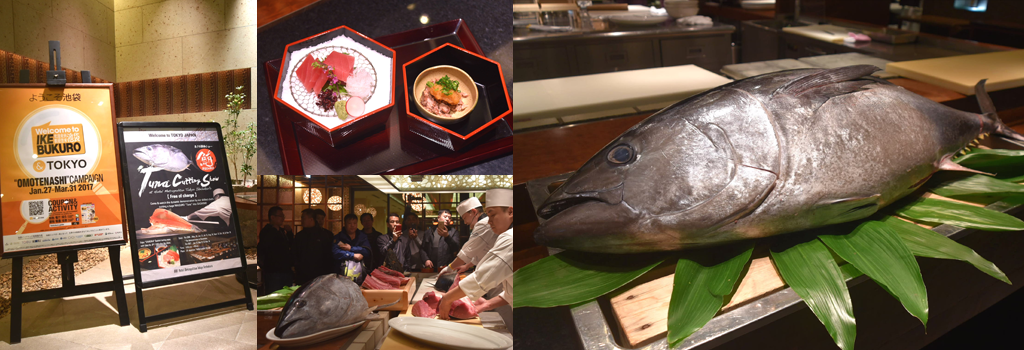 外国語ガイド付き体験イベントのひとつとして、ホテルメトロポリタン内の日本料理「花むさし旬香」では、2月21日(火)と3月14日(火)にマグロの解体ショーを開催。長崎県産の巨大な本マグロを包丁一本で鮮やかにさばいていく姿は圧巻です。「かぶと」「カマ」「腹ナカ」など部位の説明をしながら、さばいたものを次々と並べていきます。すぐ目の前で繰り広げられる解体の様子を食い入るように覗き込んだり、夢中で撮影したり、取り囲む来場者はみんな興奮気味でした。