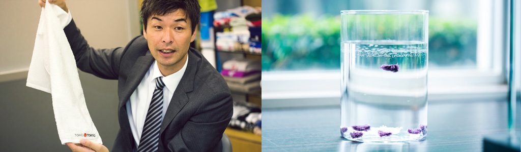 「“1秒タオル”とは、1cm角に切ったタオルを水に浮かべたときに1秒以内に水中に沈み始めるタオルのことです。これは、非常に高い吸水性があるという意味で、押し当てるだけで瞬時に水を吸収してくれます」と「1秒タオル」の由来を語るのは、ホットマン株式会社、坂本将之代表取締役社長。さらに、今回の共同企画商品への想いをお聞きしてみました。