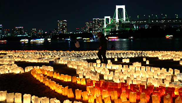 日没の頃に完成した灯火の作品は、お台場の夜景と美しく調和していました。