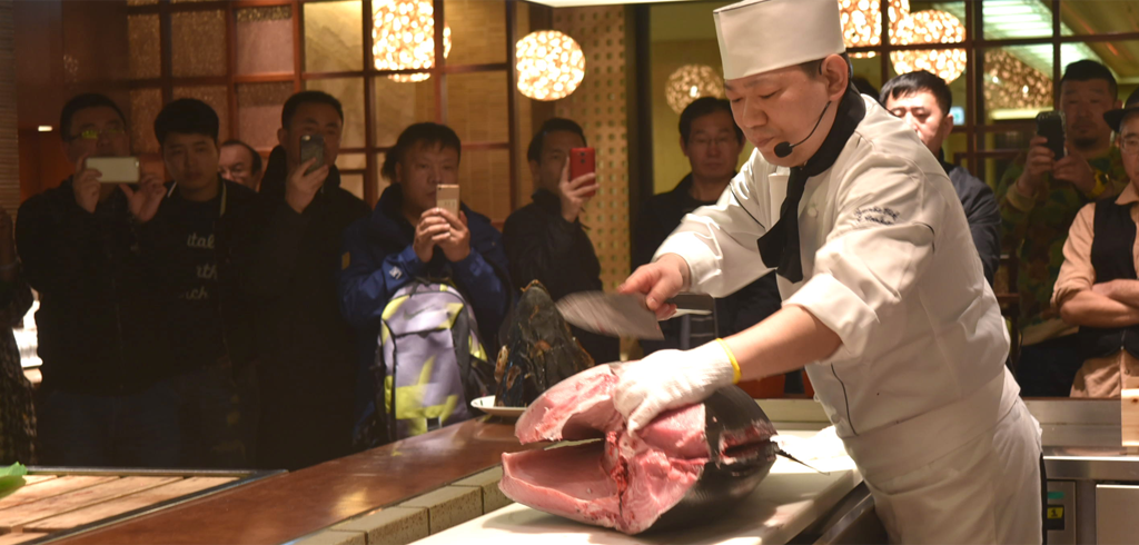 外国語ガイド付き体験イベントのひとつとして、ホテルメトロポリタン内の日本料理「花むさし旬香」では、2月21日(火)と3月14日(火)にマグロの解体ショーを開催。長崎県産の巨大な本マグロを包丁一本で鮮やかにさばいていく姿は圧巻です。「かぶと」「カマ」「腹ナカ」など部位の説明をしながら、さばいたものを次々と並べていきます。すぐ目の前で繰り広げられる解体の様子を食い入るように覗き込んだり、夢中で撮影したり、取り囲む来場者はみんな興奮気味でした。